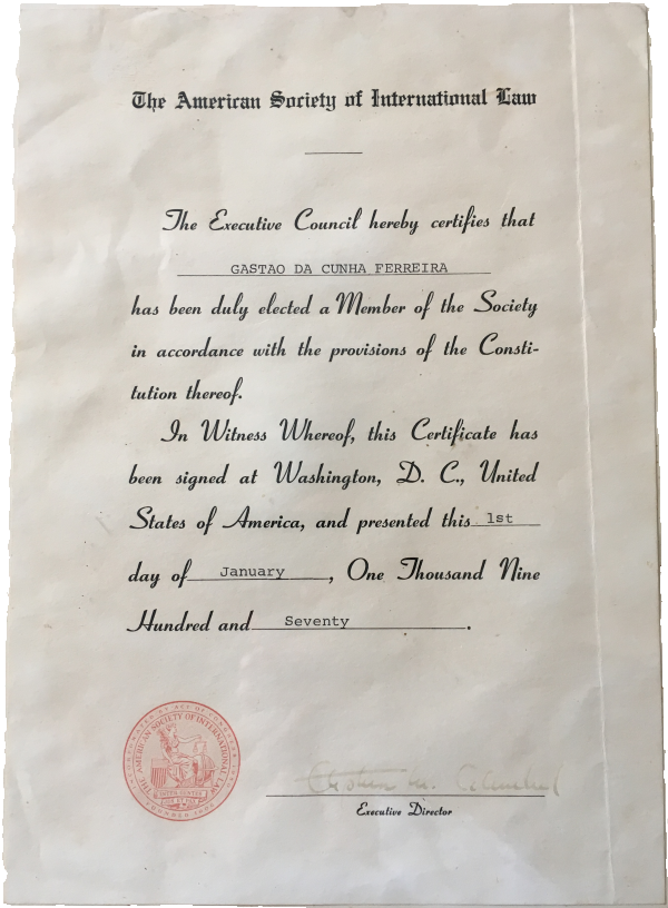 Gastão da Cunha Ferreira é aceite como membro da American Society of International Law. Desde a sua fundação em 1906, a American Society of International Law tem sido uma importante sociedade académica no campo do direito internacional. Por mais de um século, as suas publicações, conferências e programas de pesquisa e educação tornaram possível o avanço do estudo e o uso do direito internacional como pedra basilar de um mundo justo e pacífico.